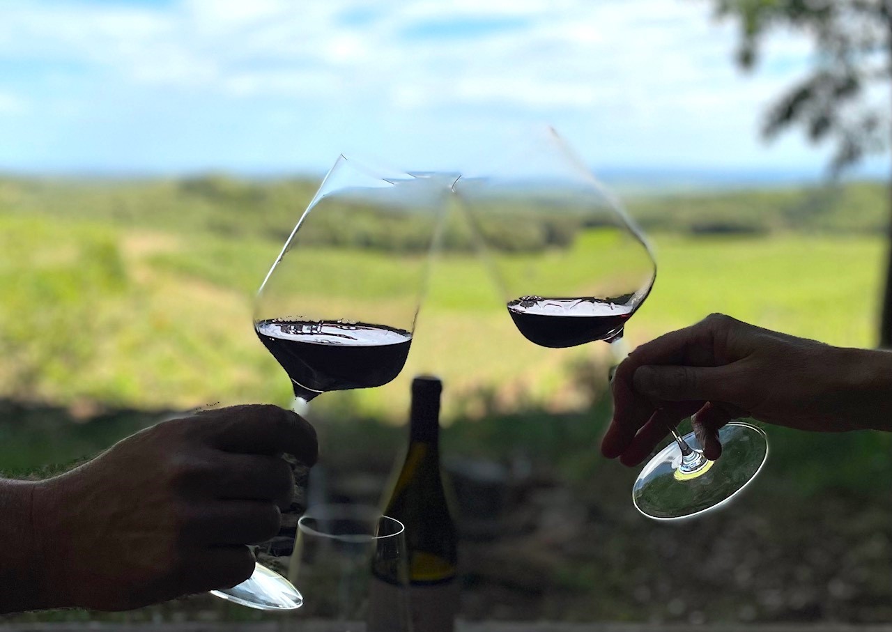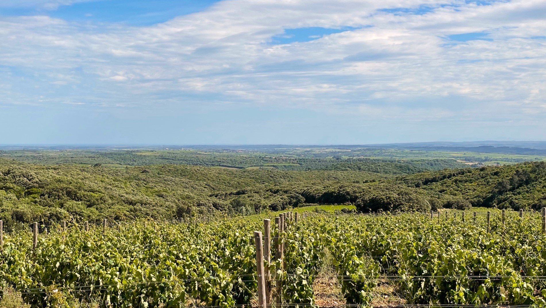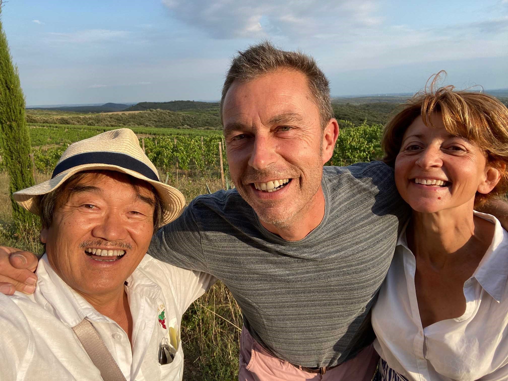 遠くに海がかすかに見える畑で、造り手のチボーとソフィーと一杯やるフォジェールは最高だ!!