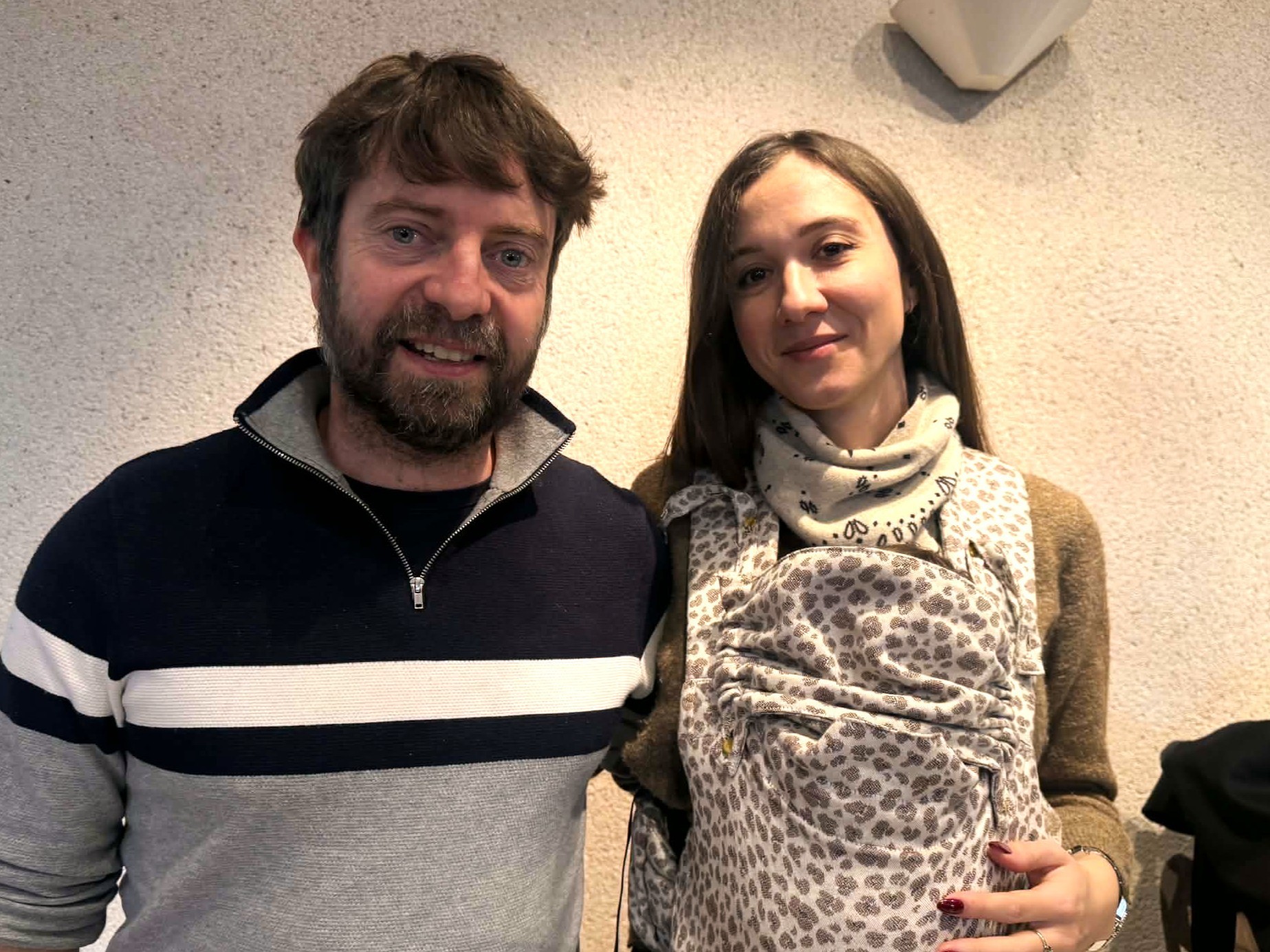 3か月前に赤ちゃんが生まれて、奥さんがおなかにおぶった姿勢で親子3人でブースに立っていました。