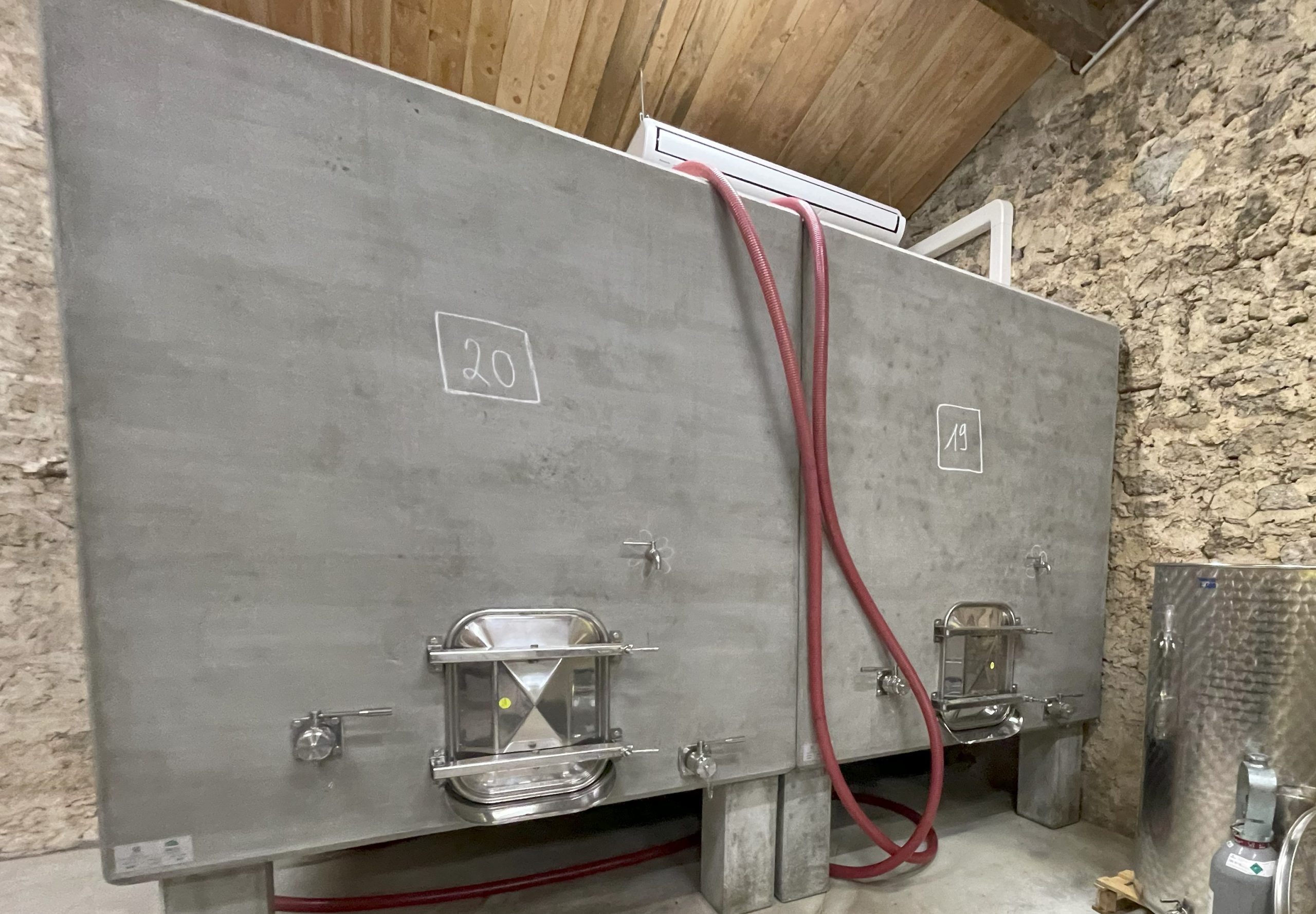 諸々の醸造設備も最初から理想的なものは買えない。優先順位で、まずは、樹脂のグラスファイバーの発酵槽では、あまり思うようなワインが造りにくいのでコンクリート槽を購入した。