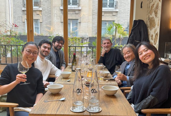 明るいバルセロナの南にあるパルティーダ・クルーズ醸造のマッシモが、ワインを抱えてParisオフィスにやって来た。 北イタリア出身のマッシモがバルセロナまで来ることになった生き様だけでも、映画になりそうな物語があり。 風対流系の専門設計家だったマッシモは、フィンドウ系スポーツ道用具を設計してミラノでは有名で大活躍していた。 ミラノでの周りの生き方に納得せず、バルセロナにやって来て、ヨット関連の設計をしていた。 ある時、バルセロナから更に南の山に行った時、自分が育った北イタリアの故郷に似た葡萄園に出逢った。 まさに。マッシモが育った北イタリアのテロワールそっくりだった。 ワインが大好きだったマッシモは、机の上の仕事に飽き飽きしていた。この葡萄園を見た瞬間に人生を変えた。 そこから、マッシモのロマンが始まった。 葡萄の種を植えて苗木を育てるという、途方もない時とリスクがかかる挑戦もやっている。 もう、やることすべてが途轍もない情熱な無ければできないことばかり。まさにロマンがある 遠くを観ながら、自分が設計したことをコツコツと実行するマッシモを見てると、感動が伝わってくる。 マッシモのワインを飲んでいると、マッシモの生きたエネルギーやロマンが伝わってくる。 イタリア人のマッシモは、やっぱりジェスチャーが凄く、まるでダンスを踊っているようだ。 暑いスペインで、酸が全面に表現されていて、フランスでは絶対に存在しないバランス感覚がある。 ワインは造り手の信念の深さ、これからどこまでやり切る覚悟があるか、で多くのことがわかる。 また、新しい境地に入っているワイン達を試飲できました。マッシモのワインは生き方にピタリと合っているスタイルだ! 試飲の後は、お鮨、美味しい肉を焼きました。そして、今が旬のモンドール・チーズを食べました。 マッシモのワインの酸と相性が完璧! そして、やっぱりワインは造った人間と一緒に飲むのが一番おいしい。 今回はバルセロナから車で飛ばして来てくれました。これからパリからバルセローナまで帰る。 マッシモのpassionがヒシヒシと伝わってきました。 こんなにエネルギーを込めて造っている人間は少ない。 ありがとう! グラッチェ・ミーレ! Massimo.